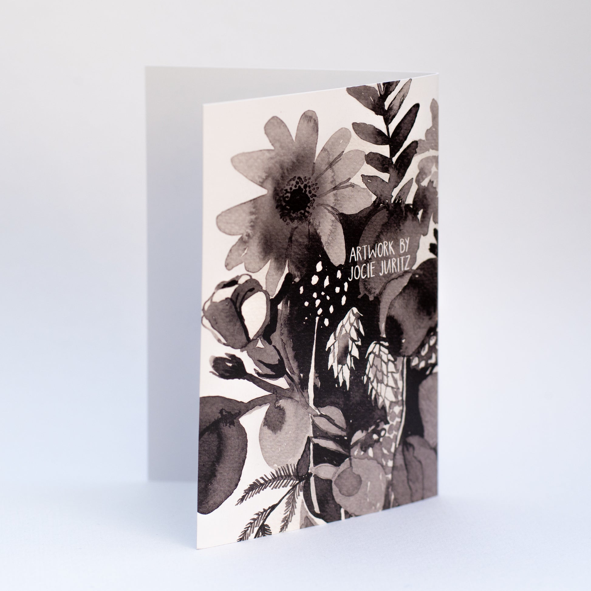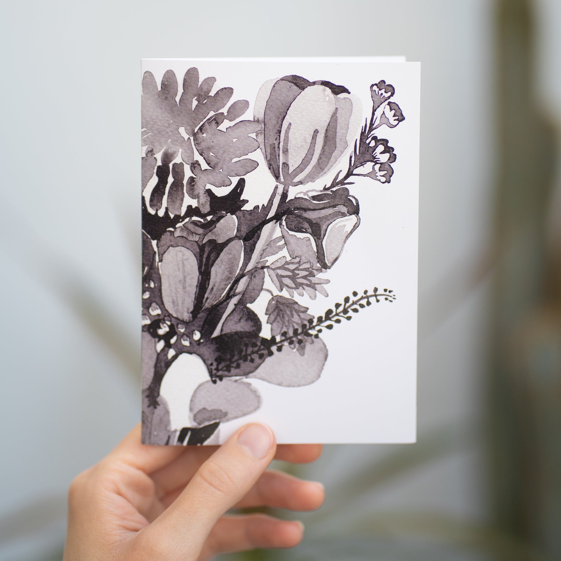 An inky, flowery greetings card. It’s completely blank inside, so you can make it your own - perfect for holidays, birthdays, thank-yous, or any little note you want to send. A6 with a silver envelope.