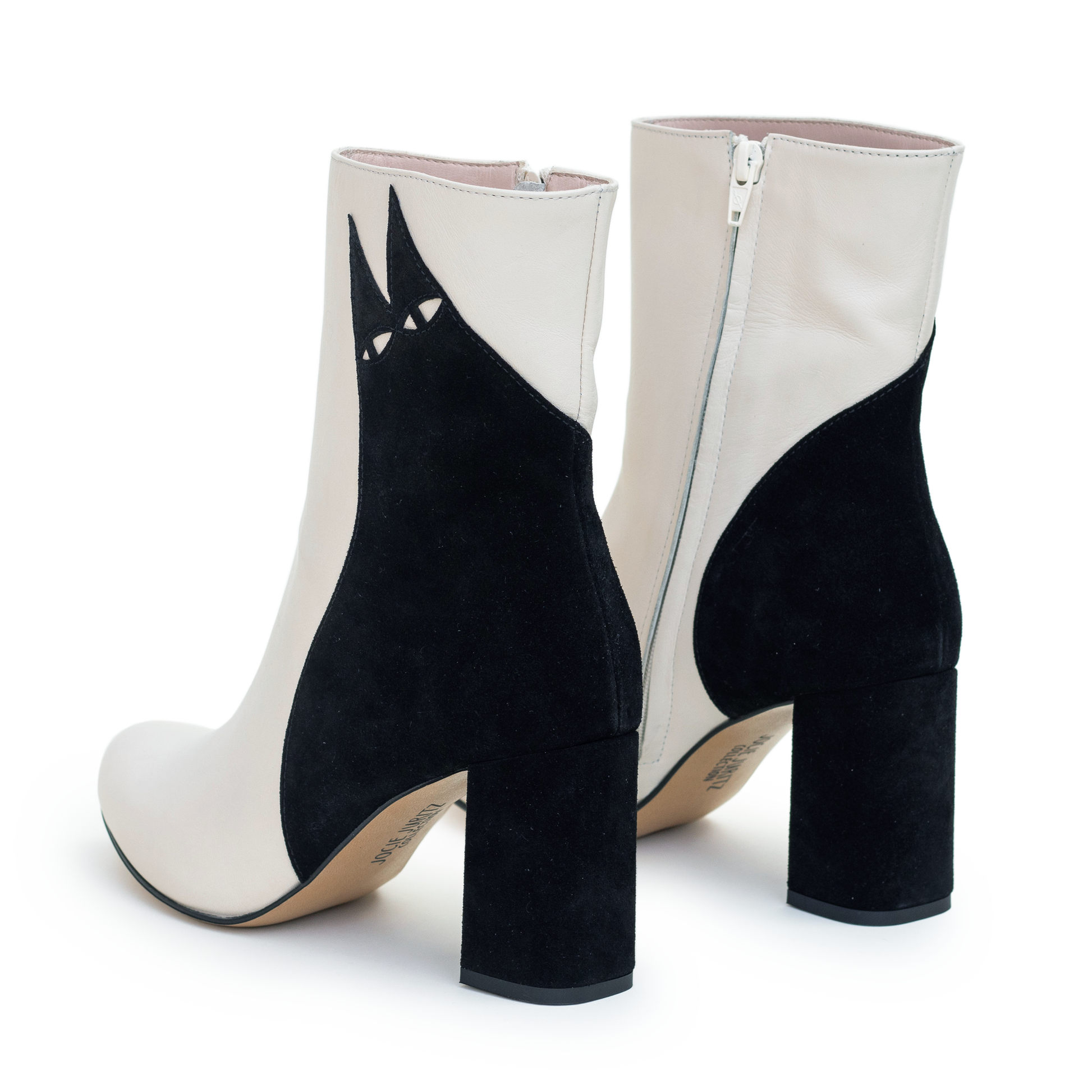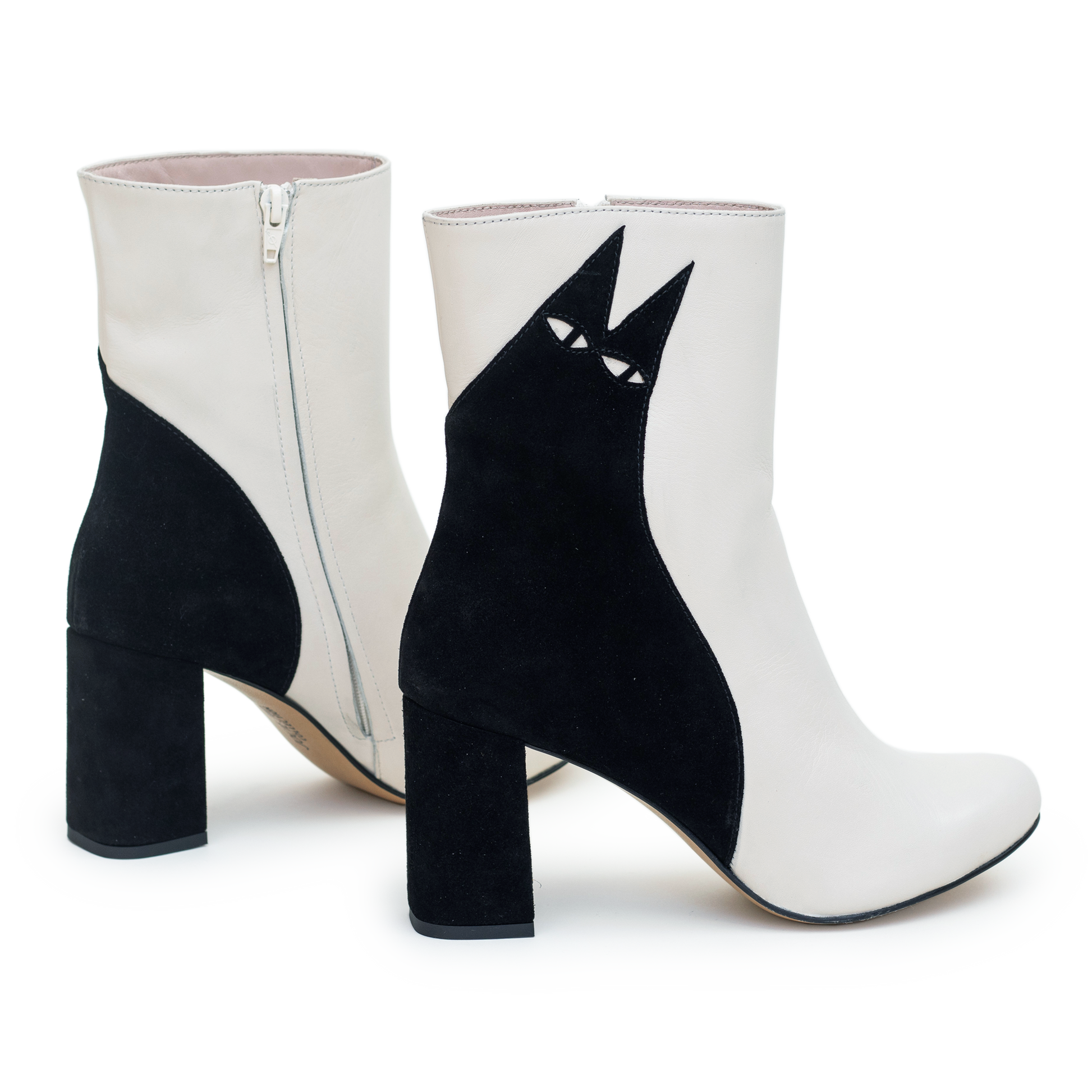 Ziggy - the original cat boot and foundation of JJCollection. Conceived from an animation, this design has been brought to life in a beautifully soft off-white leather, with a black suede cat. Finished with care - flawless black topstitching, pale pink leather lining, and cut-out eyes. Impressively wearable, the Ziggys adapt to your feet and are perfect for day, night, or both.